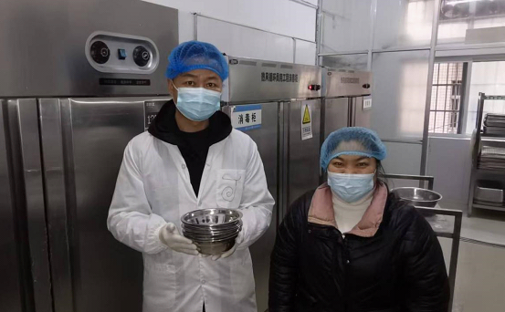 ▲工作人員在學(xué)校后廚餐飲具存放柜抽取樣品