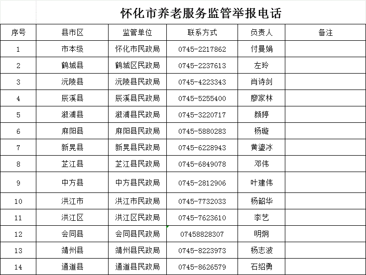 為響應(yīng)社會(huì)為老服務(wù)需求,提升養(yǎng)老服務(wù)質(zhì)量,加強(qiáng)對(duì)養(yǎng)老機(jī)構(gòu)和養(yǎng)老從業(yè)人員的監(jiān)督,回應(yīng)民眾關(guān)切,推動(dòng)養(yǎng)老事業(yè)和養(yǎng)老產(chǎn)業(yè)協(xié)同健康發(fā)展,經(jīng)市縣民政部門確認(rèn),現(xiàn)將懷化市縣兩級(jí)養(yǎng)老服務(wù)熱線和監(jiān)管舉報(bào)電話,在懷化轄區(qū)內(nèi)依法辦理法人登記并在民政部門備案且通過(guò)消防審驗(yàn)的養(yǎng)老機(jī)構(gòu)名單予以公布并接受社會(huì)各界的監(jiān)督。
